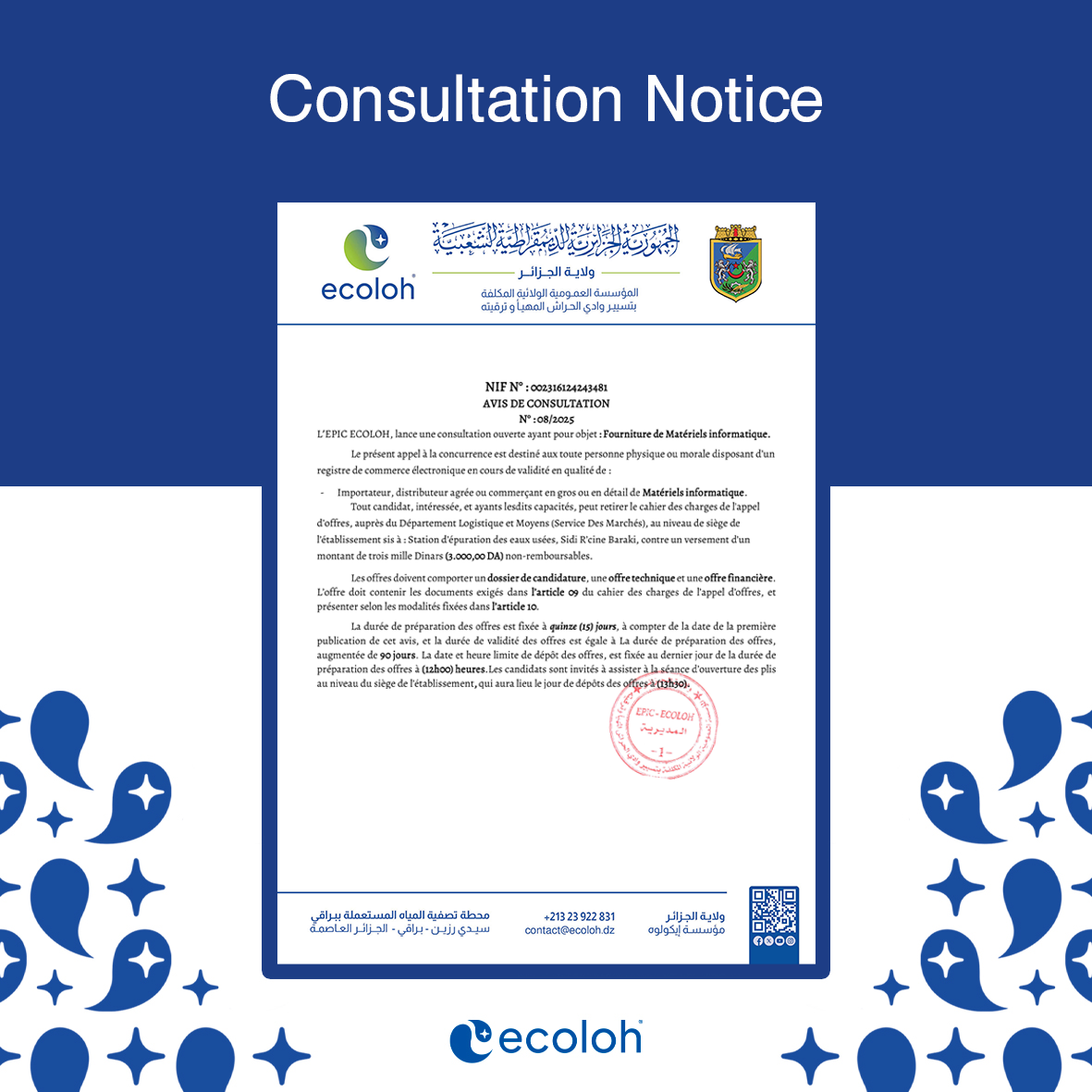 The Public Establishment of the Wilaya in charge of the management and promotion of the developed Oued El Harrach launches Consultation No. 07/2025 concerning the: Supply of IT equipment The offer preparation period is set at fifteen (15) days from …