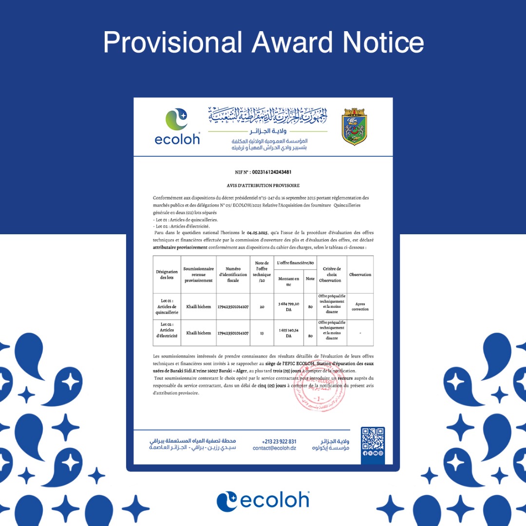 Our establishment informs all bidders who participated in Consultation No. 05/2025 regarding: Purchase of general hardware supplies Lot 01: Hardware items Lot 02: Electrical items that following the opening of bids and the evaluation of …