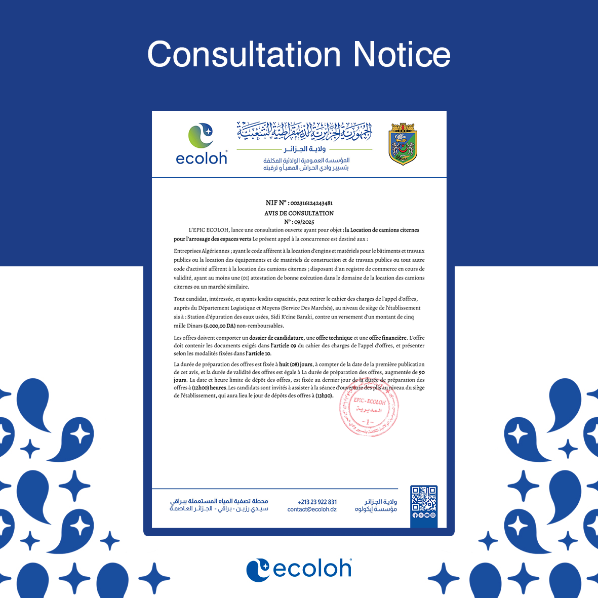 The Public Establishment of the Wilaya in charge of the management and promotion of the developed Oued El Harrach announces the launch of Consultation No. 09/2025 concerning: The rental of tanker trucks for watering green spaces. The deadline for …